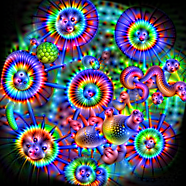 These examples use the VGG-16 network. While GoogleNet seems to fixate on dogs and slugs, VGG likes to produces badgermoles, a weird cross between a rodent and a monkey: